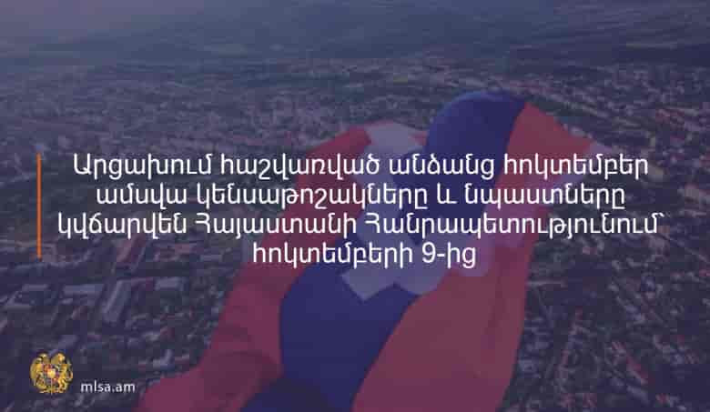 Արցախի Հանրապետությունում հաշվառված անձանց 2020 թվականի հոկտեմբեր ամսվա՝ կանխիկ եղանակով վճարվող կենսաթոշակները և պետական նպաստները կվճարվեն Հայաստանի Հանրապետությունում՝ սկսած հոկտեմբերի 9-ից։