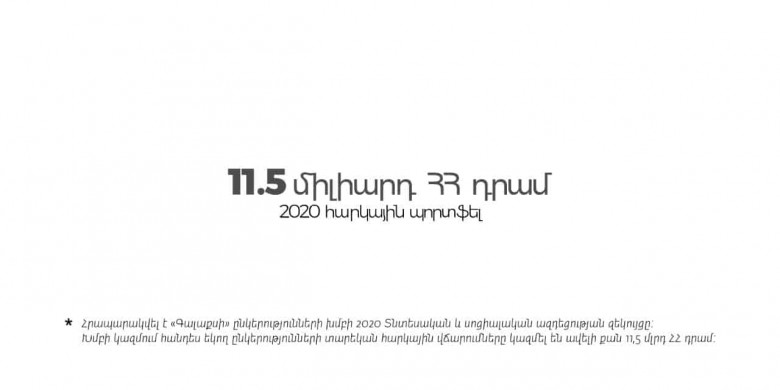 Հայաստանի խոշոր հարկատուներից ու գործատուներից «Գալաքսին», որը համախմբում է 15 բիզնես միավոր, հրապարակել է 2021թ. տնտեսական և սոցիալական ազդեցության տարեկան զեկույցը, որում ներկայացված են ընկերությունների խմբի 2020թ. հարկային և վարկային պորտֆելը, աշխատակիցների թիվն ու աշխատավարձային ֆոնդը, երկրի ՀՆԱ-ի վրա ազդեցության տվյալներ և կարևոր այլ տեղեկատվություն։