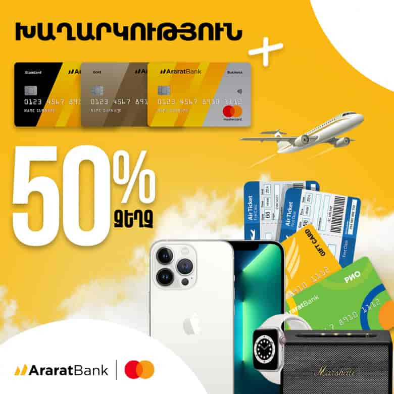 Ուշադրության կենտրոնումԱրարատԲանկը MasterCard միջազգային վճարային համակարգի հետ համատեղ 2021թ․ նոյեմբերի 1-ից դեկտեմբերի 25-ը հայտարարում է համատեղ ակցիա և «խելահեղ խաղարկություն»։
