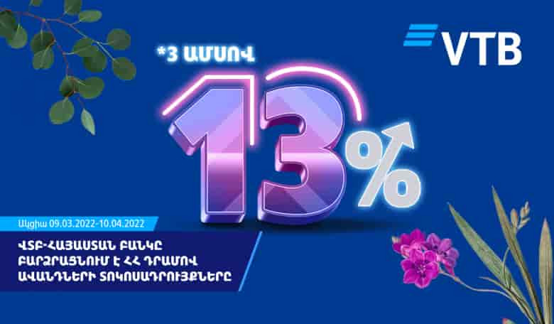 Ուշադրության կենտրոնումԱկցիայի շրջանակներում ՎՏԲ-Հայաստան Բանկը բարձրացնում է ֆիզիկական անձանց՝ ՀՀ դրամով «Շահավետ» և «Պրոգրես» ավանդների տոկոսադրույքները: Ավանդների առավելագույն տոկոսային եկամտաբերությունը հասնում է տարեկան 13,49%-ի։