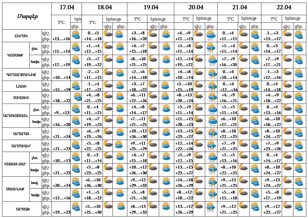 Ուշադրության կենտրոնումՀանրապետության տարածքում ապրիլի 17-ի ցերեկը, 18-19-ին սպասվում է առանց տեղումների եղանակ: Ապրիլի 20-ի ցերեկը շրջանների զգալի մասում սպասվում է կարճատև անձրև և ամպրոպ: Քամին՝ հարավ-արևմտյան 2-5 մ/վրկ, ապրիլի 20-ին սպասվում է քամու ուժգնացում՝ 18-23մ/վրկ արագությամբ: Օդի ջերմաստիճանն ապրիլի 17-19-ին աստիճանաբար կբարձրանա 3-6 աստիճանով։