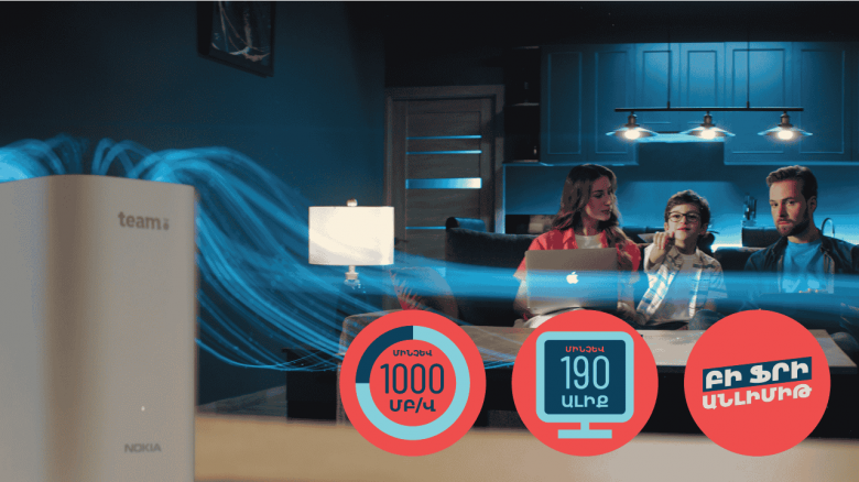 Բաժանորդագրվելով Team-ի COSMO և COMBO փաթեթներին՝ հաճախորդի տանը, ըստ անհրաժեշտության տեղադրվելու էNokia GPON և NokiaBeaconWiFi ուժեղացուցիչ անլար ինտերնետի անգերազանցելի որակ ապահովելու համար։