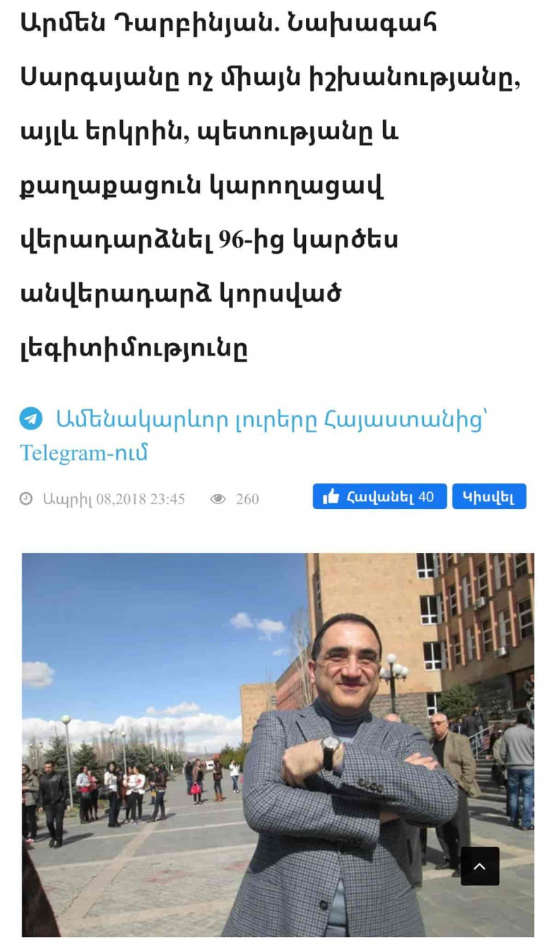 Նկարում առկա տողերը Դարբինյանն ասել է 2018 թվականին, երբ նախագահ Սերժ Սարգսյանն առաջադրվել էր որպես վարչապետի թեկնածու, իսկ դրանից մի քանի օր անց Դարբինյանն այս գրառումը հեռացրեց ֆեյսբուքից և սկսեց «ոռ մտնել» արդեն ազգակործաններին: