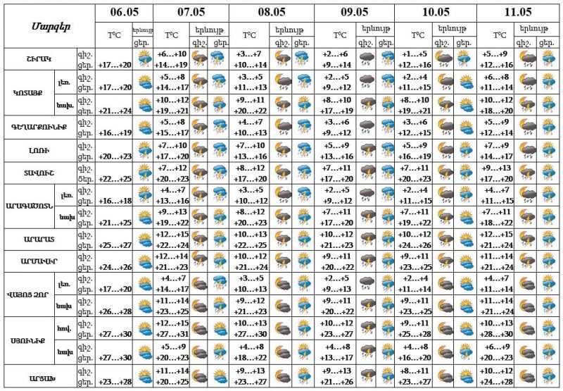 Մայիսի 6-ի ցերեկը սպասվում է առանց տեղումների եղանակ։ Մայիսի 7-11-ը սպասվում է կարճատև անձրև և ամպրոպ։ Ամպրոպի ժամանակ՝ քամու ուժգնացում՝ 13-15 մ/վ արագությամբ։