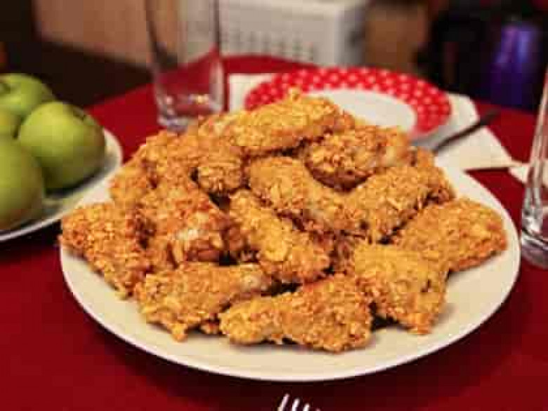 Եթե ուզում ենք, կծու լինի, կաթով և ձվով զանգվածին պապրիկա և կծու պղպեղ ենք խառնում։ Եթե ուզում ենք կարող ենք սխտոր էլ ճզմել մեջը, կարող ենք նաև մի քիչ աղ անել։ Ամբողջ գաղտնիքը պաքսիմատի մեջ է, որի մեջ էլ պետք է թաթախենք թևիկները։ Վերցնում ենք եգիպտացորենի փաթիլները, ձեռքերով մանրացնում ենք։ Ձվով զանգվածի մեջ թաթախելուց հետո թաթախում ենք եգիպտացորենի փաթիլների մեջ։