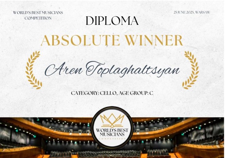 «Երաժշտություն հանուն ապագայի» հիմնադրամի կրթաթոշակառու, թավջութակահար Արեն Թոփլաղալցյանի համար հունիսը կարծես միջազգային մրցանակների բերքահավաքի շրջան լինի։ Այս ամիս նա հասցրել է մասնակցել «International Youth Music Competitions» միջազգային մրցույթին և արժանացել Գրան Պրիի։ «International Youth Music Competitions»-ը հարթակ է տրամադրում երաժիշտներին։ Մրցույթն իր ուշադրության կենտրոնում է պահում երաժշտական բոլոր ոճերն և գործիքները։