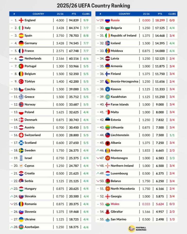 Ազգային ասոցիացիաների թարմացված վարկանիշը՝ ստորև․