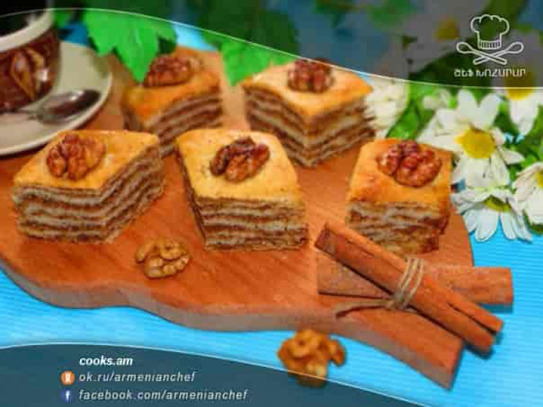 - Վրայից մանրացված ընկույզ ենք լցնում։ Նույն կերպ շարում ենք նաև մնացած շերտերը։