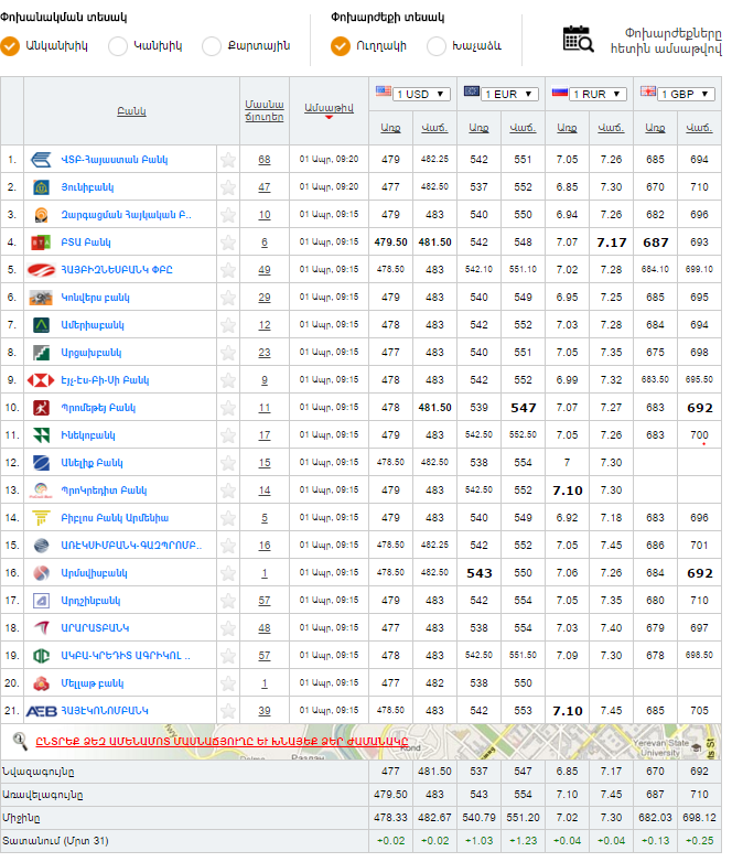 Ռուսական ռուբլու դեպքում պատկերը հետևյալն է. մեկ ռուբլին գնվում է նվազագույնը 6.85 դրամով և վաճառվում 7.17 դրամով։ Առավելագույնը մեկ ռուբլին գնվում է 7.10 դրամով և վաճառվում 7.45 դրամով։