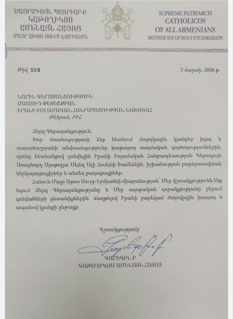 Ամենայն հայոց կաթողիկոսը մարտի 2-ին ցավակցական հեռագիր է հղել Իրանի նախագահ Մասուդ Փեզեշքիանին՝ երկրի ղեկավարության և քաղաքացիների շրջանում գրանցված զոհերի կապակցությամբ։ Այս մասին հայտնում է Երևանում Իրանի դեսպանատունը։