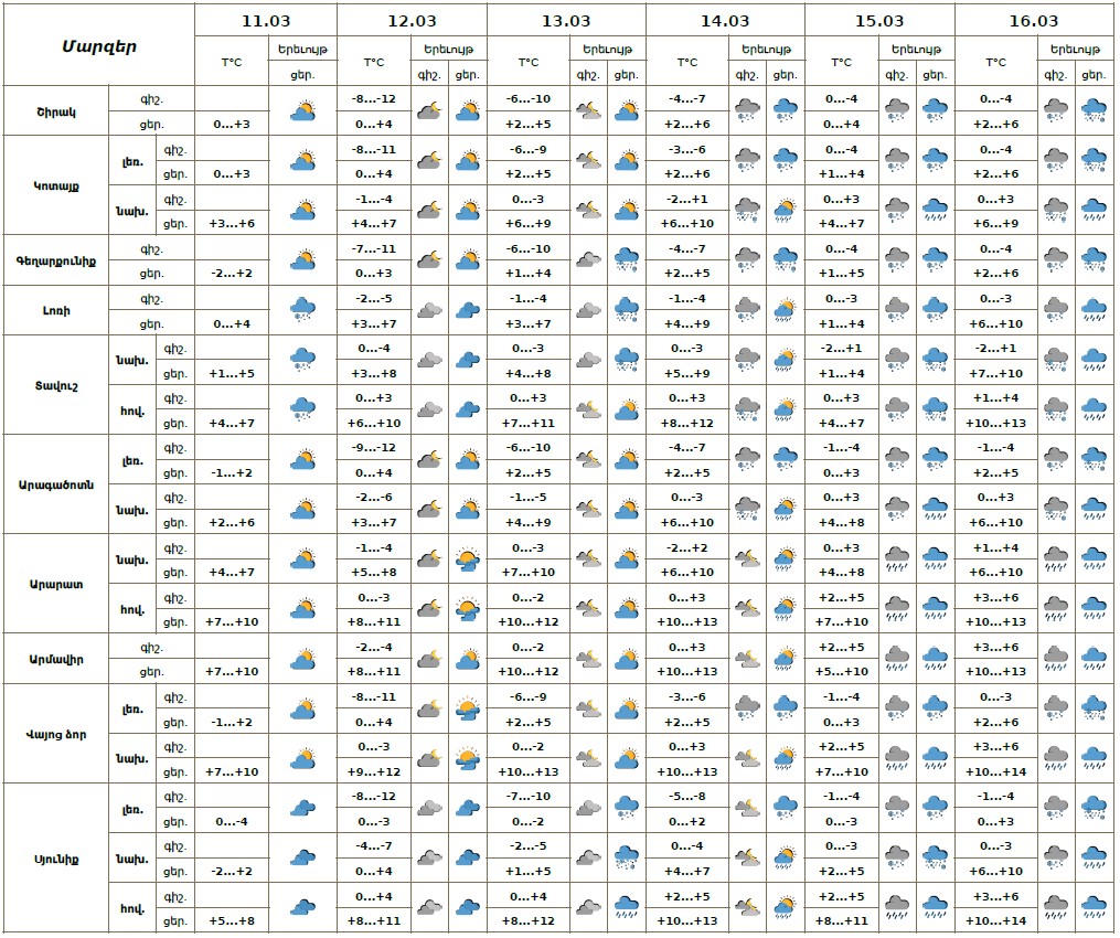 Օդի ջերմաստիճանը մարտի 11-14-ին ցերեկը աստիճանաբար կբարձրանա 3-6, մարտի 12-15-ին գիշերը 7-10 աստիճանով։