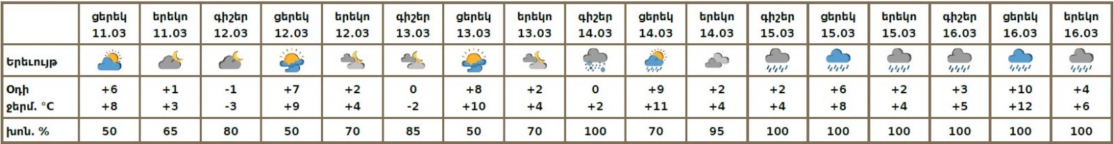 Մարտի 11-ի ցերեկը, 13-14-ին առանձին շրջաններում, 15-16-ին շրջանների մեծ մասում սպասվում են տեղումներ․ լեռնային և նախալեռնային շրջաններում ձյան, հովտային շրջաններում ձնախառն անձրևի և անձրևի տեսքով։ Մարտի 12-ին սպասվում է առանց տեղումների եղանակ։ Քամին`հյուսիսարևելյան ` 2-5 մ/վ։