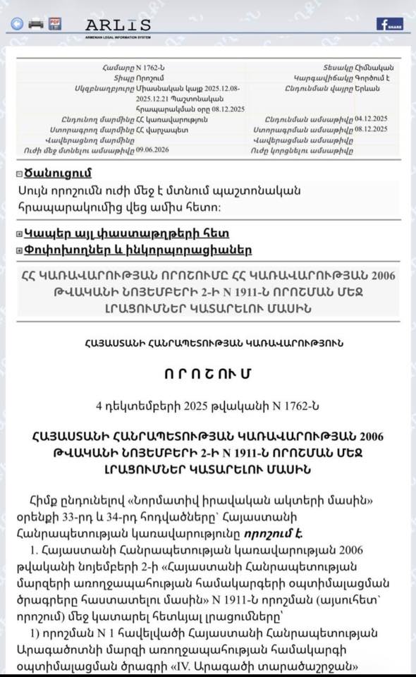 ՀՀ կառավարության 2025 թվականի դեկտեմբերի 4-ի N 1762-Ն որոշմամբ նախատեսվում է իրականացրել հետևյալը`