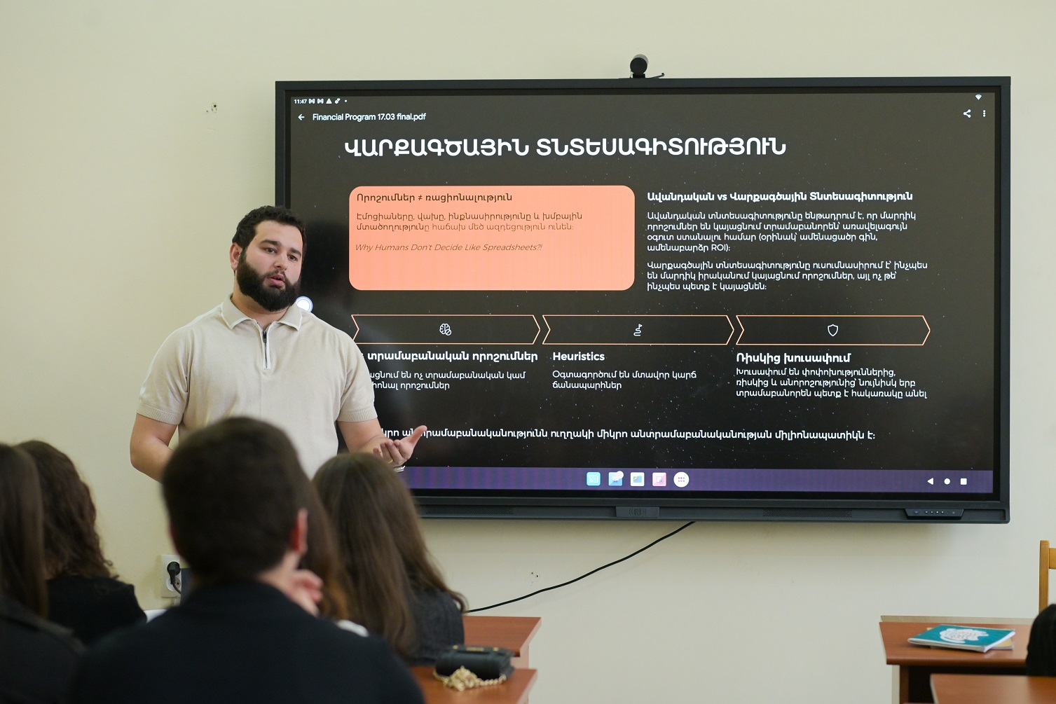 Այս անգամ IDBank-ը և Իդրամը անցկացրին եռօրյա դասընթաց Երևանի պետական համալսարանի Տնտեսագիտության և կառավարման ֆակուլտետի ուսանողների հետ՝ ներկայացնելով ֆինանսական մտածողության հիմունքները։