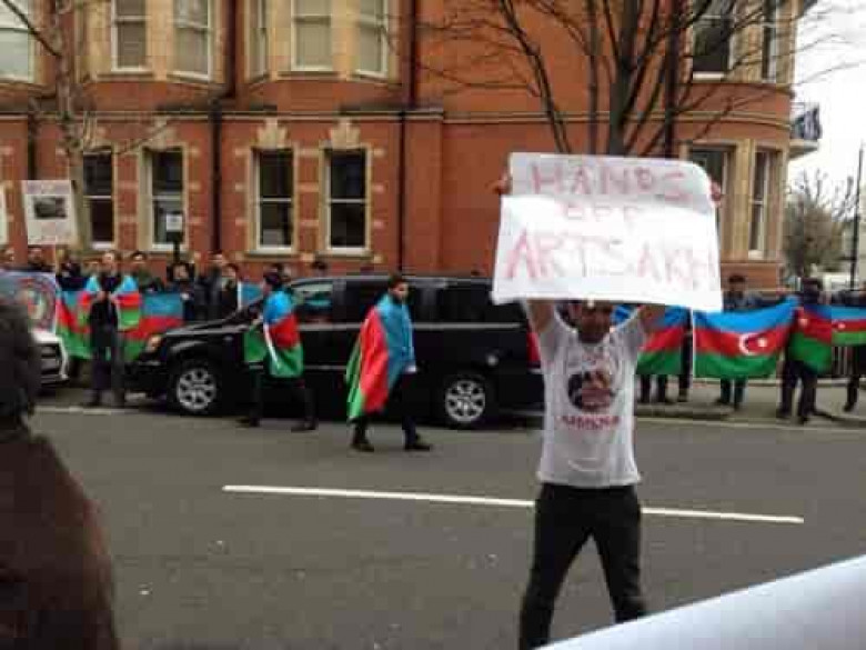 Պարզվում է, լոնդոնցի ադրբեջանցիները երեկ կազմակերպել են ցույց, որին «մասնակցել է» նաեւ երիտասարդ Արամը։ Տղան տասնյակ ադրբեջանցիների առաջ դուրս է եկել «Hands off Artsakh» (ձեռքներդ հեռու Արցախից) գրառումով պաստառով, իսկ նրա շապիկին գրված է եղել «Հայաստան»։