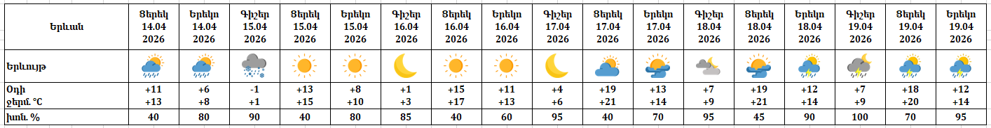 Ապրիլի 14-ի ցերեկը, 15-ի գիշերն առանձին շրջաններում սպասվում են տեղումներ. լեռնային և առանձին նախալեռնային գոտիներում կդիտվեն ձյան և ձնախառն անձրևի, հովտային գոտիներում՝ անձրևի տեսքով։ Ապրիլի 18-ի ցերեկը, 19-ին առանձին շրջաններում սպասվում է անձրև, հնարավոր է ամպրոպ։ Ապրիլի 15-ի ցերեկը, 16-17-ին, 18-ի գիշերը սպասվում է առանց տեղումների եղանակ։