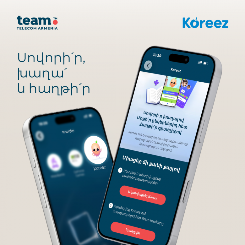 17-ը ապրիլի, 2026 թ, Երևան. Սովորի՛ր, խաղա՛ և հաղթի՛ր.  Team Telecom Armenia-ն և Koreez համահայկական կրթական ծրագիրը նախաձեռնել են նոր համագործակցություն՝ միավորելով ուժերը դպրոցականների կրթության զարգացման նպատակով: Team Telecom Armenia-ի բաժանորդները այսուհետ կարող են հեշտությամբ օգտվել Koreez կրթական հավելվածից՝ անմիջապես My Team հավելվածի միջոցով: