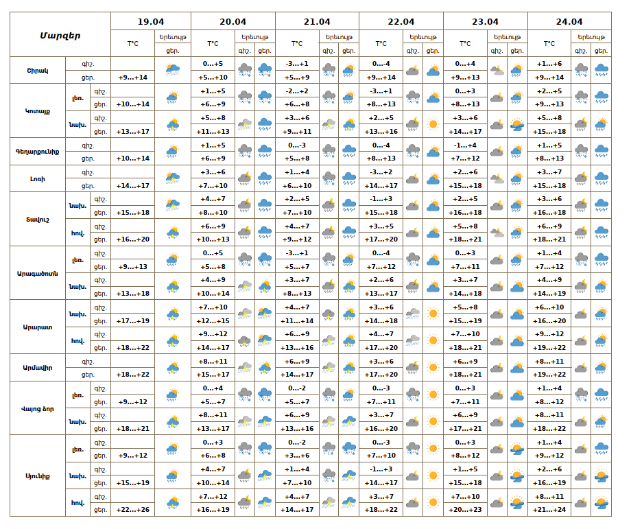 Հանրապետության տարածքում ապրիլի 19-ի ցերեկը, 20-21-ը ժամանակ առ ժամանակ շրջանների զգալի մասում, 22-ի գիշերը, 23-ի ցերեկը, 24-ին առանձին շրջաններում սպասվում է անձրև, հնարավոր է ամպրոպ։ Ապրիլի 19-ի երեկոյան ժամերին, 20-21-ը, 22-ի գիշերն առանձին շրջաններում տեղումները կլինեն ինտենսիվ։ Ապրիլի 20-22-ը, 24-ին տեղումները լեռնային շրջաններում գիշերը և առավոտյան ժամերին կլինեն թաց ձյան տեսքով։ Ապրիլի 22-ի ցերեկը, 23-ի գիշերը սպասվում է առանց տեղումների եղանակ։