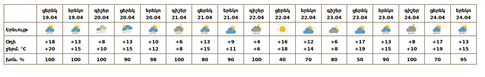 Երևան քաղաքում ապրիլի 19-ի ցերեկը, 20-21-ը ժամանակ առ ժամանակ, 22-ի գիշերը, 23-ի կեսօրից հետո, 24-ին սպասվում է անձրև և ամպրոպ, ապրիլի 20-ին՝ ինտենսիվ։ Ամպրոպի ժամանակ՝ քամու ուժգնացում՝ 15-18 մ/վ արագությամբ։ Ապրիլի 22-ի ցերեկը, 23-ի գիշերը սպասվում է առանց տեղումների եղանակ։