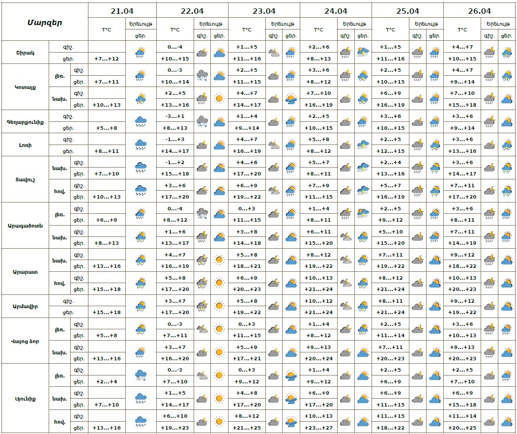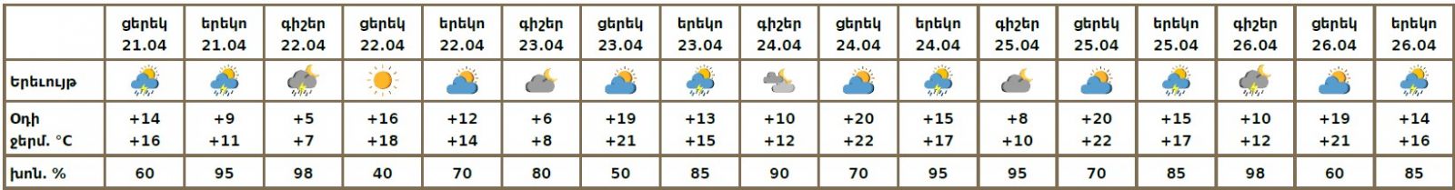 Ապրիլի 21-ի ցերեկը, 22-ի գիշերը, 23-25-ին կեսօրից հետո, 26-ին գիշերը և կեսօրից հետո սպասվում է անձրև և ամպրոպ, ամպրոպի ժամանակ՝ քամու ուժգնացում մինչև 16-19մ/վ արագությամբ։ Ապրիլի 22-ի ցերեկը, 23-25-ի գիշերային ժամերին սպասվում է առանց տեղումների եղանակ։