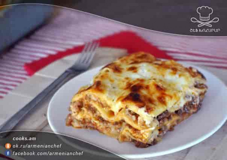 - Լազանյան թխում ենք մոտ 30 րոպե` մինչև 180 աստիճան տաքացրած ջեռոցի մեջ։ Պատրաստի լազանյան 15-20 րոպե սառեցնում ենք, այնուհետև կտրում ենք և մատուցում։