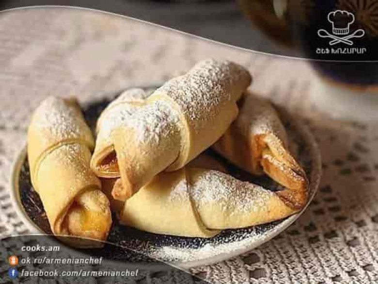 - Կարագը գոլորշու վրա թեթևակի հալեցնում ենք։ Այնուհետև ավելացնում ենք շաքարավազը, դեղնուցները, թթվասերը և խառնում ենք։ Աստիճանաբար ալյուր ավելացնելով խմոր ենք հունցում։ Խմորը 3 մասի ենք բաժանում և 30 րոպեով տեղափոխում ենք սառնարանը։ Յուրաքանչյուր մասը 30 սմ տրամագծով և 2-3 մմ հաստությամբ շրջանաձև գրտնակում ենք։ Շրջանը 8 հավասար հատվածների ենք կիսում, կամ էլ եթե ցանկանում ենք թխվածքները փոքր լինեն` 12 մասի ենք բաժանում։ Յուրաքանչյուր կտորի լայն մասի վրա մուրաբա ենք լցնում և փաթաթում ենք։