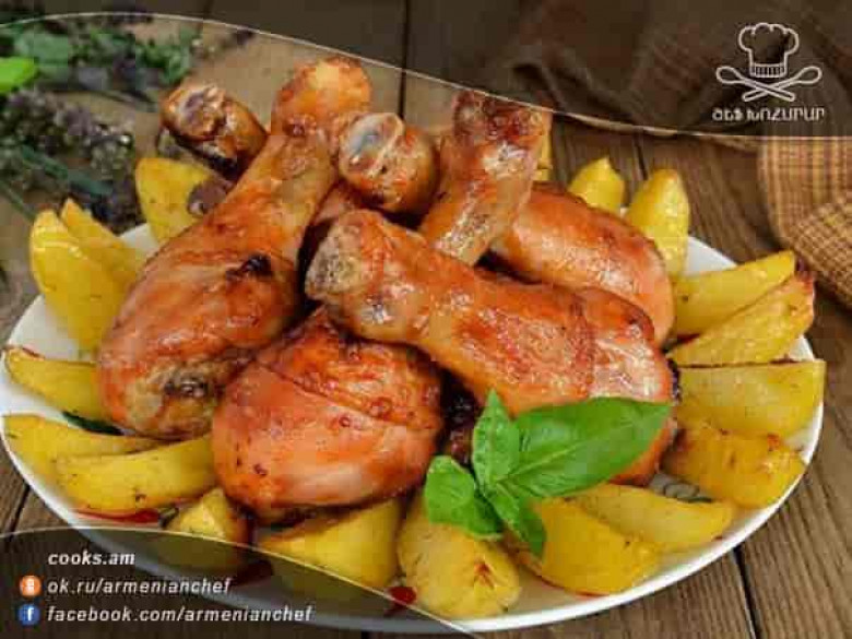 - Եփում ենք նախապես մինչև 190 աստիճան տաքացրած ջեռոցի մեջ` մինչև կարմրեն։