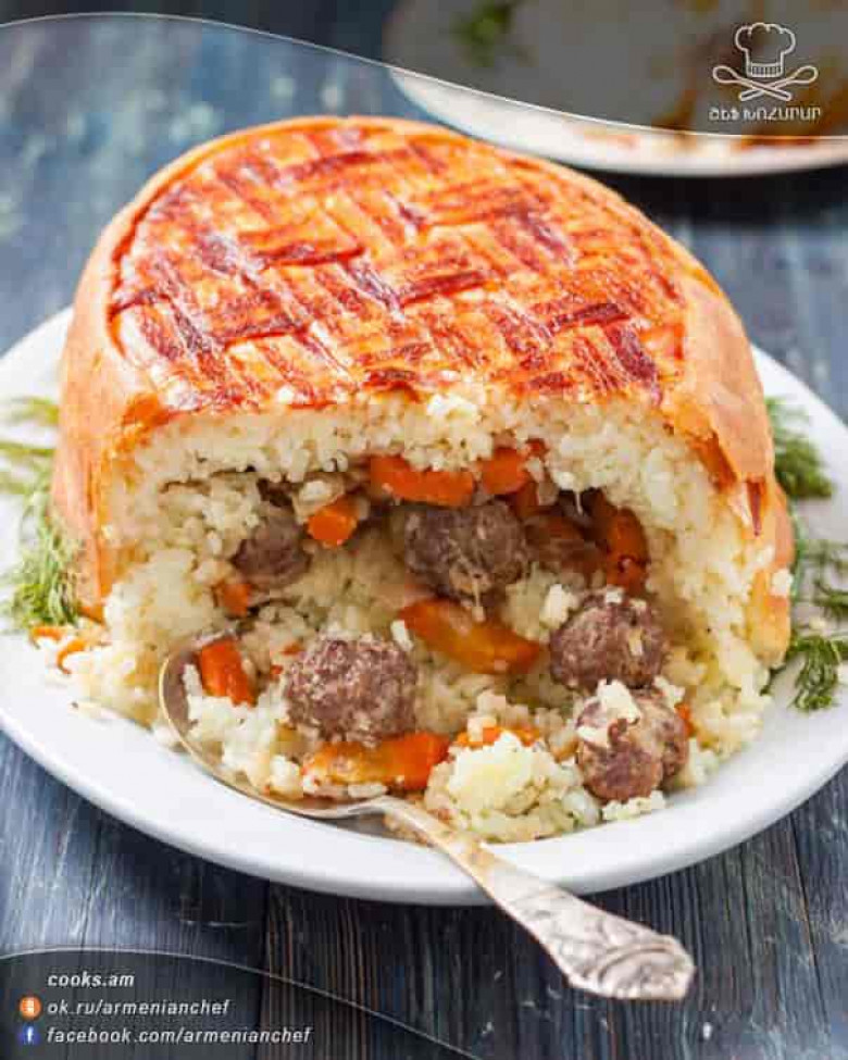 - Կափարիչով ծածկում ենք և 200 աստիճան տաքացրած ջեռոցում 20 րոպե թխում ենք, այնուհետև կափարիչը բացում ենք և ևս 20-30 րոպե եփում ենք։ Խմորը պետք է ամբողջությամբ եփվի, խրթխրթան և ոսկեգույն դառնա` ոչ միայն կողքերից, այլև վրայից։ Պատրաստի փլավն անմիջապես ձևամանից չենք հանում, մոտ 10 րոպե թողնում ենք, այնուհետև զգուշորեն շրջում ենք մատուցարանի մեջ։