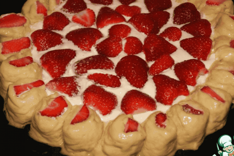 Խմորի տրամագծով շարել ելակները, ծածկել ծայրերից, հավասարաչափ կտրվածքներ անել ու փրջել, որ ելակները երևան։