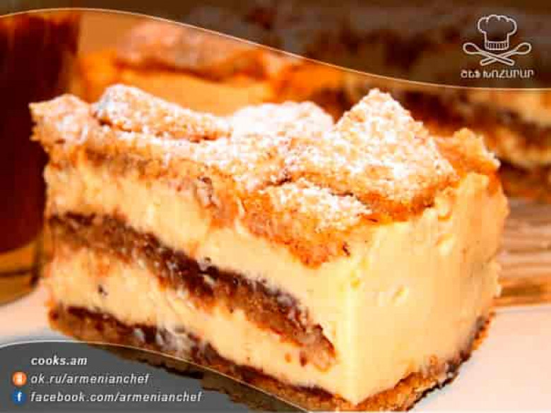 - Կրեմ. ձվի դեղնուցները 160 գր շաքարավազի, օսլայի և կաթի հետ հարում ենք մինչև համասեռ խառնուրդ ստանանք, այնուհետև ավելացնում ենք կիտրոնի կեղևը և դնում թույլ կրակի վրա։ Խառնիչով անընդհատ խառնելով եփում ենք մինչև կրեմը հարթ դառնա, այնուհետև կրակից վերցնում ենք և կիտրոնահյութ ավելացնում։ Ամբողջությամբ սառեցնում ենք։ Սերուցքը հարում ենք մինչև կայուն փրփուր ստանանք, միացնում ենք սառած կրեմի հետ և հարիչով հարում ենք։