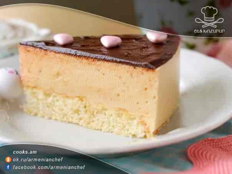 - Շերտը դնում ենք բացվող ձևամանի մեջ, վրան ենք լցնում սուֆլեն և թողնում ենք պնդանա։ Սուֆլեն սենյակային ջերմաստիճանում շատ արագ է պնդանում։ Շոկոլադը կարագի հետ գոլորշու վրա հալեցնում ենք և լցնում տորթի վրա։ Տորթը մի քանի ժամով տեղափոխում ենք սառնարանը, այնուհետև հանում ենք ձևամանից, կտրում և մատուցում։ Բարի ախորժակ։