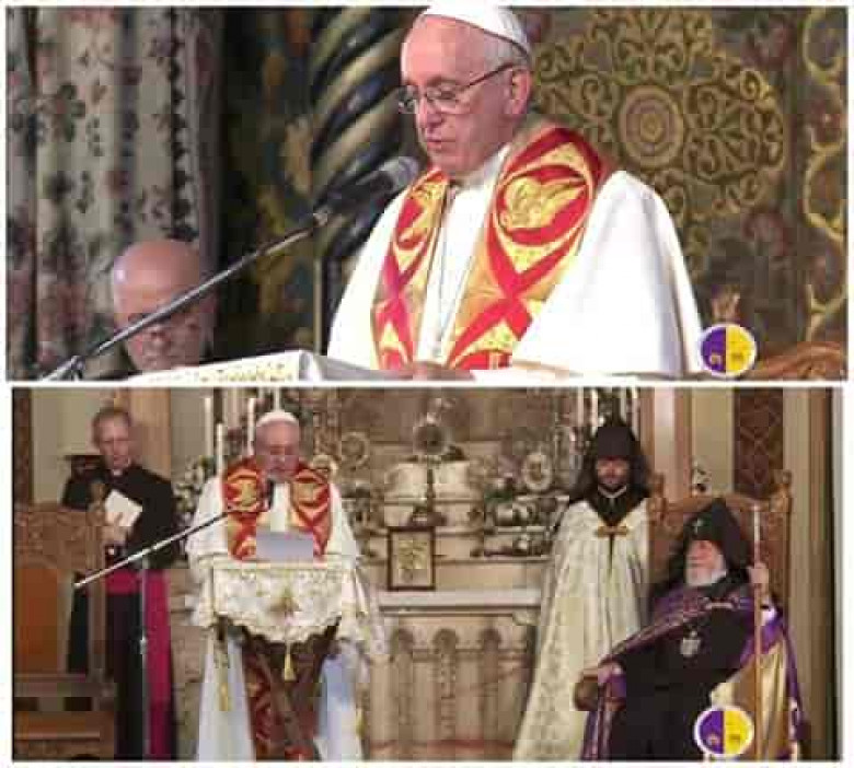 Գոհութիւն եմ մատուցում Տիրոջ նաեւ այն ընթացքին համար որ Կաթողիկէ Եկեղեցին եւ Հայ Առաքելական Եկեղեցին կատարեցին եղբայրական եւ անկեղծ երկխօսութեան միջոցով, հասնելու համար լիարժէք կիսելու գոհութեան Սեղանը: Սուրբ Հոգին թող օգնի մեզ իրականացնելու այն միութիւնը, որի համար աղօթեց մեր Տէրը, որպէսզի իր աշակերտները մի լինեն եւ աշխարհը հաւատայ: Ինձ հաճելի է յիշել այժմ, մեր երկու Եկեղեցիների միջեւ յարաբերութիւնների խորացման եւ երկխօսութեան ամրապնդման՝ վերջերս տրուած վճռորոշ մղումը, Նորին Սրբութիւններ Վազգէն Ա-ի եւ Գարեգին Ա-ի եւ սուրբ Յովհաննէս Պօղոս Բ-ի եւ Բենեդիկտոս ԺԶ-ի կողմից: Համամիութենական այս ջանքերի յատկապէս նշանակալից փուլերի շարքին յիշում եմ Ի դարու հաւատի Վկաների յիշատակութիւնը, 2000 թուականի Մեծ Յոբելեանի շրջանակներում. Ձերդ Սրբութեան յանձնումը քրիստոնեայ Հայաստանի Հօր՝ Ս. Գրիգոր Լուսաւորչի մասունքից՝ Երեւանի նորակառոյց Տաճարի համար. Նորին Սրբութիւն Յովհաննէս Պօղոս Բ-ի եւ Ձերդ Սրբութեան ստրոգրած համատեղ Յայտարարութիւնը՝ ճիշտ այստեղ, Սուրբ Էջմիածնում. ինչպէս նաեւ Ձերդ Սրբութեան կատարած այցերը Վատիկան, կարեւոր պահերի եւ յիշատակութիւնների առիթով: