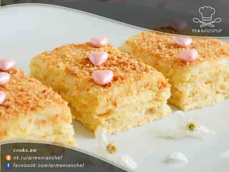 - Շերտերը թխում ենք մոտ 10 րոպե` մինչև 180 աստիճան տաքացրած ջեռոցի մեջ։ Սառեցնում ենք։ Շերտերի անհավասար եզրերը կտրում ենք և փշրում։ Շերտը դնում ենք մատուցարանի վրա, առատորեն պատում ենք կրեմով և ծածկում երկրորդ շերտով և այդպես բոլոր շերտերն իրար վրա ենք դնում։