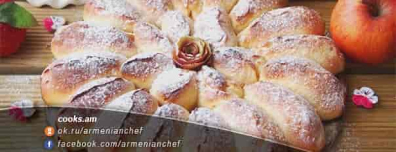 - Յուրաքանչյուր շրջանի կենտրոնում մի կտոր խնձոր ենք դնում, փաթաթում խմորի մեջ և դնում բուսայուղով պատված յուղաթղթապատ ձևամանի մեջ։ Վրան ցանում ենք դարչնի հետ խառնած մնացած շաքարավազը։