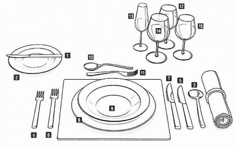 4. Գինու և ջրի ձեր բաժակները պետք է գտնվեն ձեր ափսեից աջ: Իսկ հացը` ձախ: Անգլերենում այս կանոնը կոչվում ` "BMW" - bread, meal, water, ինչը թարգմանաբար նշանակում է` հաց, ուտելիք, ջուր: