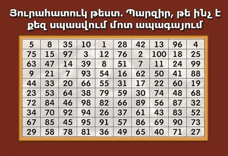 LifeԵրազանք պահեք, փակեք ձեր աչքերը, այնուհետև պատահականության սկզբունքով աղյուսակից ընտրեք որևիցե մի թիվ: Որ թիվն ընկնի, կարդացեք համապատասխան տարբերակը