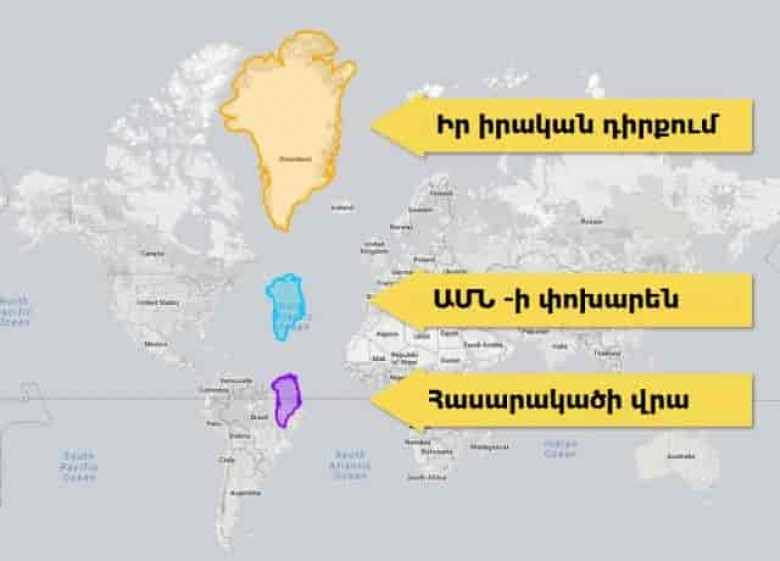 Սկզբի համար եկեք նայենք Գրենլանդիային։ Առաջին հայացքից այն հսկայական է՝ չափերով մոտ Աֆրիկա մայրցամաքին։ Սակայն երբ այն տեղափոխում ենք դեպի հասարակածը, պարզ է դառնում, որ դա հասարակ կղզի է՝ որը աննշան է Աֆրիկայի համեմատությամբ։