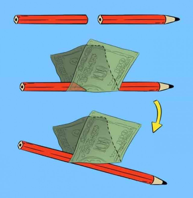 Այս հնարքը իսկական հրաշքներ է գործում։ Մենք ակնհայտ տեսնում ենք, որ մատիտը անցնում է թղթադրամի միջով, սակայն իրկանում տեղի է ունենում հակառակը։ Մատիտը անկյունագծով կտրված է և միացված է մգնիսներով։ Այն ուղղակի արագ բաժանվում և միանում է։