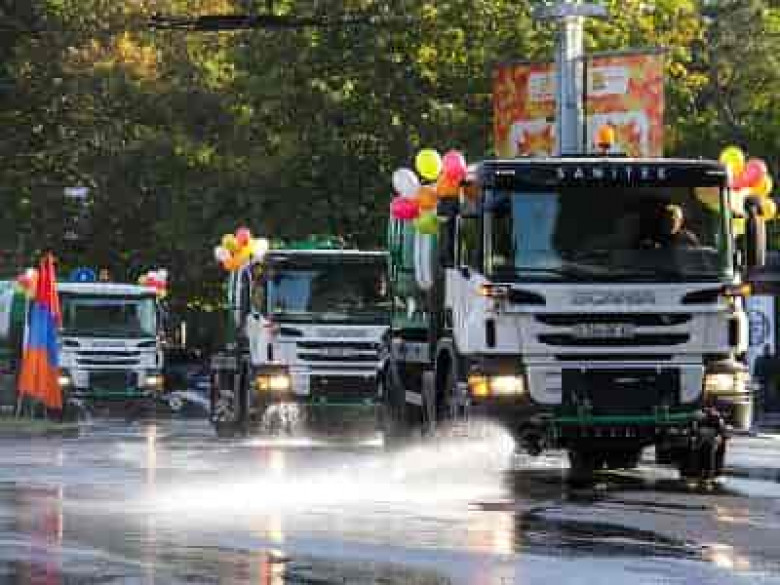 «Սանիթեք» ընկերության՝ տոնականորեն զարդարված նոր ու ժամանակակից ջրցան մեքենաների առավոտյան երթը մայրաքաղաքի գլխավոր ու երկրորդական փողոցներում սկսվել է ձայնային ազդանշաններով եւ վերածվել իսկական շքերթի: