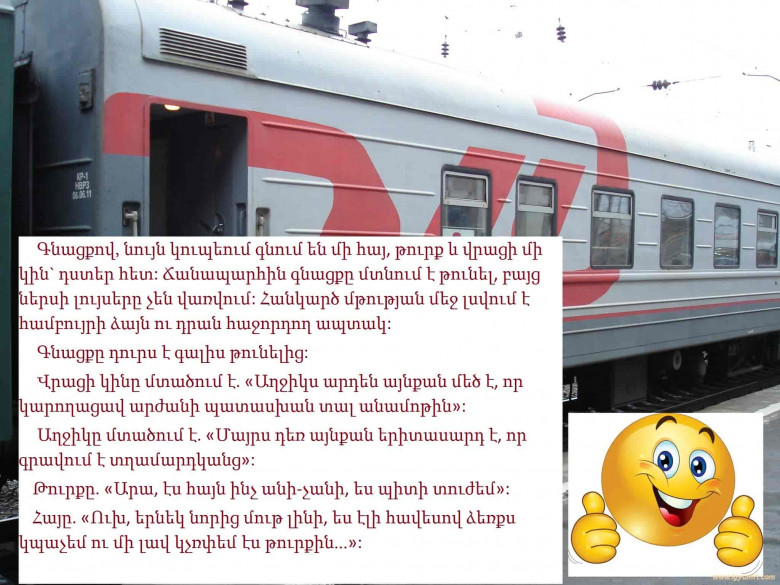 Իսկ էս անեկդոտը լսել եք , որ գնացքով նույն կուպեում գնում են հայը , թուրքը և վրացի կինը ՝ դստեր հետ... Life 7 Նոյեմբեր, 2016 14:27 Կիսվել Կիսվել