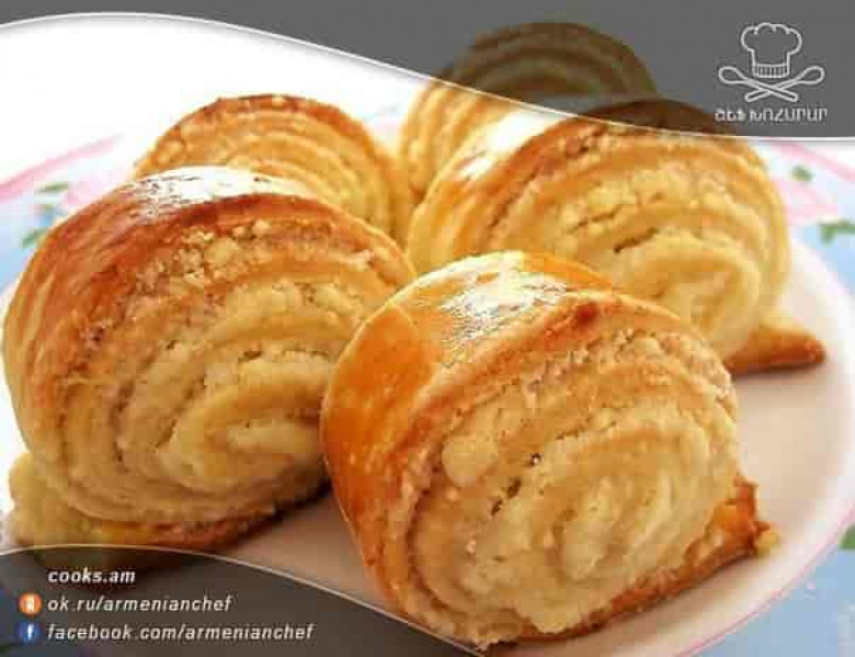 Ստացված ռուլետները կտրատում ենք, տալով գաթայի տեսք, դնում պերգամենտային թղթով պատած տապակի վրա, վրան քսում ենք հարած դեղնուցն ու կաթը և թխում ջեռոցում 25-30 րոպե 180 աստիճանում: