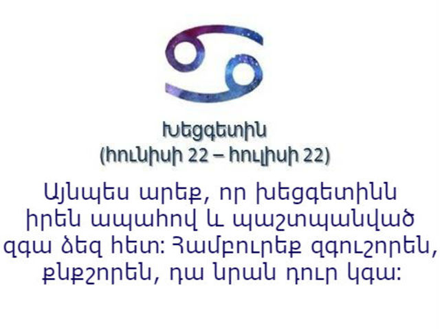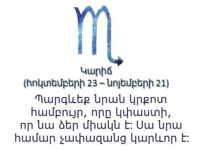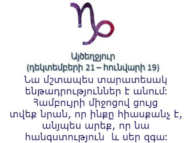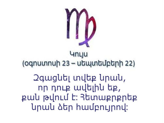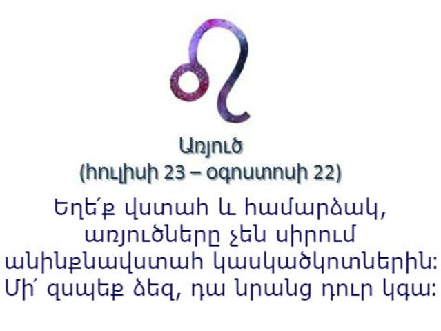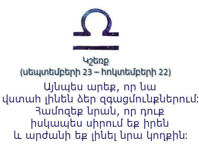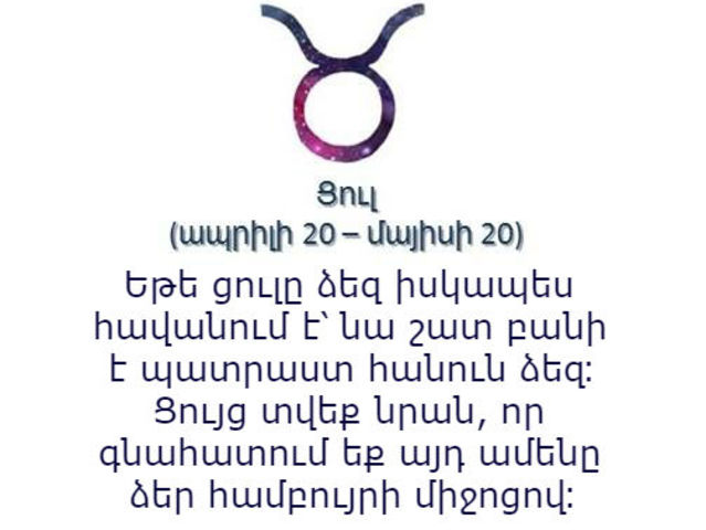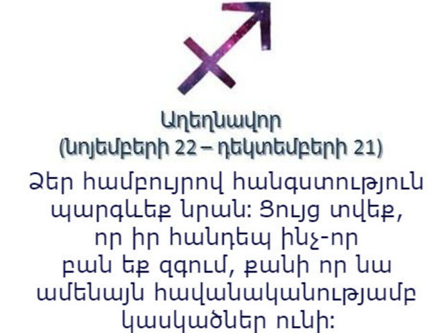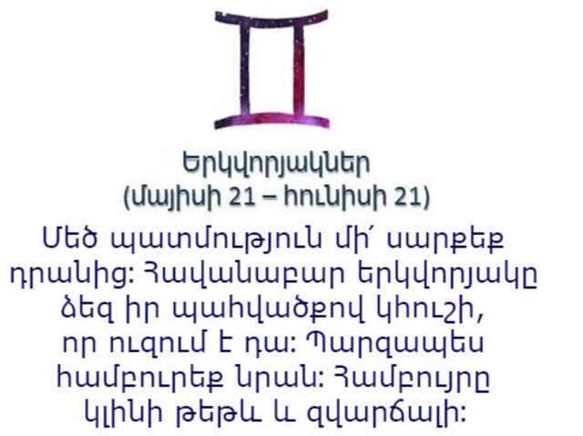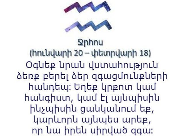 Խոյ սեղմեք՝ բացահայտելու համար 2 Ցուլ սեղմեք՝ բացահայտելու համար 3 Երկվորյակներ սեղմեք՝ բացահայտելու համար 4 Խեցգետին սեղմեք՝ բացահայտելու համար 5 Առյուծ սեղմեք՝ բացահայտելու համար 6 Կույս սեղմեք՝ բացահայտելու համար 7 Կշեռք սեղմեք՝ բացահայտելու համար 8 Կարիճ սեղմեք՝ բացահայտելու համար 9 Աղեղնավոր սեղմեք՝ բացահայտելու համար 10 Այծեղջյուր սեղմեք՝ բացահայտելու համար 11 Ջրհոս սեղմեք՝ բացահայտելու համար 12 Ձկներ սեղմեք՝ բացահայտելու համար