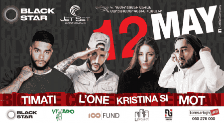 ՀասարակությունՄայիսի 12-ին Կարեն Դեմիրճյանի անվան մարզահամերգային համալիրում տեղի է ունենալու Black Star-ի անդամների երկրորդ համերգը Հայաստանում: Այս անգամ մենք կվայելենք ոչ թե երկու, այլ չորս երգիչների ելույթները: Timati-ին և L’One-ին միանալու են Мот-ը և Кристина Си-ն:
