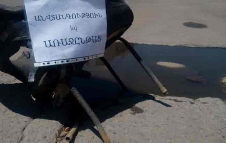 ՔաղաքականությունԱրդեն մեկ ամիս է, ինչ Գյումրու ավտոկայանը Վարդանանց հրապարակին կապող Շահումյան փողոցում առկա ջրափոսերի կողքին աթոռներն են տեղադրված: Աթոռները դրվել են, որպեսզի մեքենաները չհայտնվեն ջրափոսերի մեջ: Գյումրեցիները աթոռներին «Անվտանգություն և առաջընթաց» պաստառներ են փակցրել: