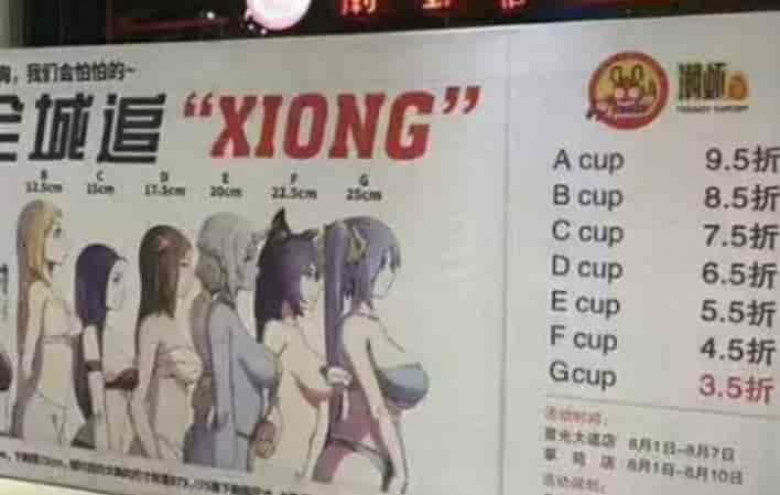 ՀասարակությունՉինաստանի Հանչժոու քաղաքի (Չժեցզյանի նահանգ) բնակիչները տեղական իշխանություններին գանգատվել են ռեստորանի գովազդային պաստառի համար, որն այցելուներին զեղչ է առաջարկում նրանց կրծքի չափին համապատասխան: Այդ մասին հայտնել Է BBC News-ը: