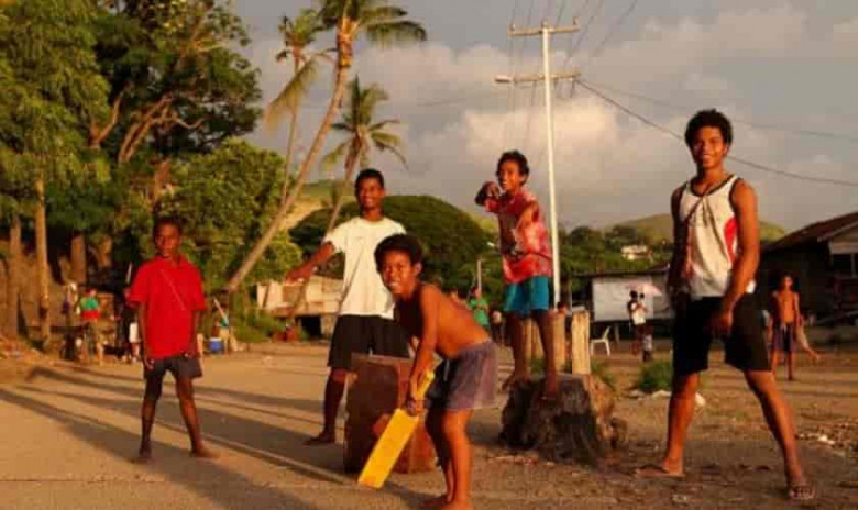 Վերոնշյալ լուսանկարում Հանուաբադա գյուղի երեխաները փողոցում կրիկետ են խաղում, 2012 թ. փետրվարի 24, Պորտ-Մորսբի, Պապուա-Նոր Գվինեա