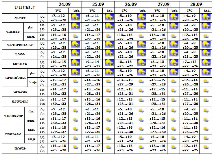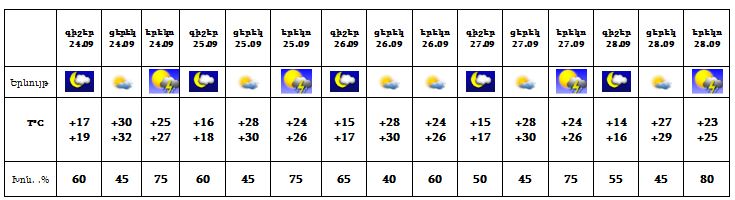 Սեպտեմբերի 24-28-ը հանրապետության տարածքում, առավելապես հյուսիսային շրջաններում, երեկոյան ժամերին սպասվում է կարճատև անձրև և ամպրոպ, ամպրոպի ժամանակ հնարավոր է քամու ուժգնացում՝ 15-20 մ/վ արագությամբ: