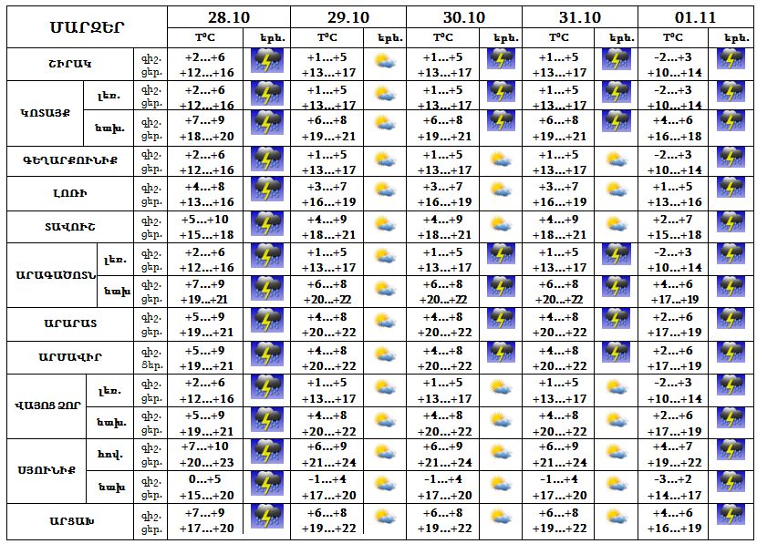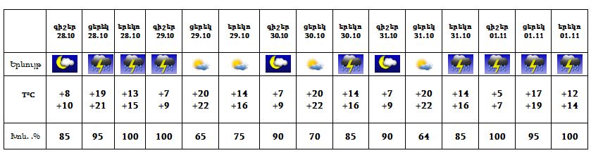 Երևան քաղաքում՝ Հոկտեմբերի 28-ին` օրվա երկրորդ կեսին, 29-ի գիշերը, նոյեմբերի 1-ին սպասվում է, 30-31-ը հնարավոր է անձրև և ամպրոպ, նաև՝ քամու ուժգնացում՝ 12-17 մ/վ արագությամբ: 29-ի ցերեկը սպասվում է առանց տեղումների եղանակ: