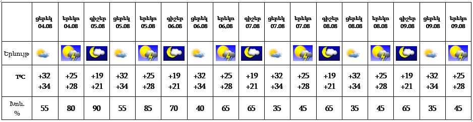 Երևան քաղաքում՝ օգոստոսի 4-ի երեկոյան ժամերին սպասվում է 5-9-ը, երեկոյան ժամերին քաղաքի առանձին հատվածներում հնարավոր է անձրև և ամպրոպ, ամպրոպի ժամանակ՝ քամու ուժգնացում՝ 18-20 մ/վ: