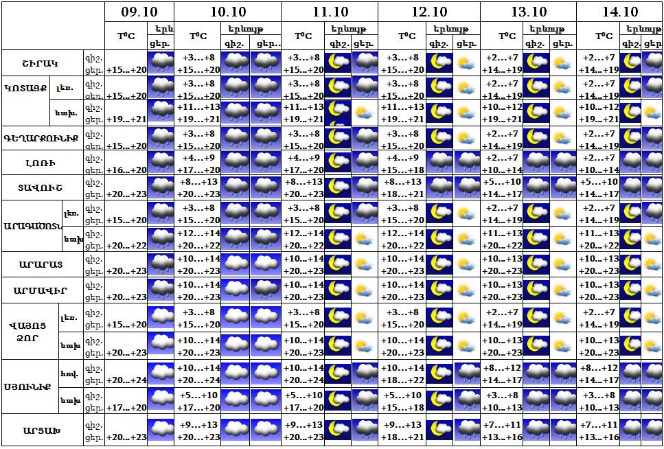 ՀասարակությունՀոկտեմբերի 9-ի ցերեկը, 10-11-ը, 14-ն առանձին շրջաններում, 12-13-ը Լոռիում, Տավուշում, Սյունիքում և Արցախում սպասվում է թույլ անձրև։